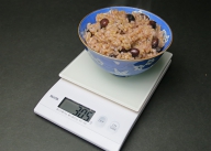 2. 茶碗をのせて 「風袋引き」ボタンを押して「0」にして